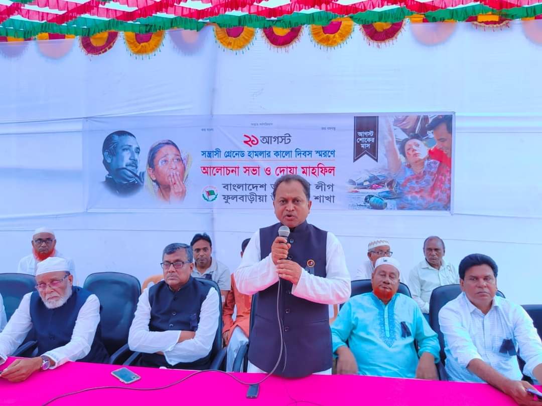 মোঃ সাবিউদ্দিন: বাংলাদেশ আওয়ামী লীগ ফুলবাড়ীয়া উপজেলা শাখার উদ্যোগে ২১ আগস্ট সন্ত্রাসী গ্রেনেড হামলার কালো দিবস স্মরণে আলোচনা সভা ও দোয়া মাহফিল অনুষ্ঠিত হয়। ফুলবাড়ীয়া উপজেলা আওয়ামী লীগের সভাপতি জননেতা অ্যাড. ইমদাদুল হক সেলিমের সভাপতিত্বে ও সাধারণ সম্পাদক হারুন অর রশিদ হারুনের সঞ্চালনায় সাবেক জেলা আওয়ামী লীগ উপদেষ্টা বীরমুক্তিযোদ্ধা অ্যাড. আব্দুর রাজ্জাক, উপজেলা আওয়ামী লীগ সহ-সভাপতি ও পৌর মেয়র আলহাজ্ব মোঃ গোলাম কিবরিয়া, উপজেলা আওয়ামী লীগের যুগ্ম সাধারন সম্পাদক আবু কাওসার মিলন, যুব ও ক্রীড়া বিষয়ক সম্পাদক মোঃ সাইদুল ইসলাম সহ উপজেলা আওয়ামী লীগ ও সহযোগী সংগঠনের নেতা-কর্মী ও বিভিন্ন ইউনিয়ন এর নেতৃবৃন্দ উপস্থিত ছিলেন। এ সময় বক্তারা দিবসটির তাৎপর্য ও গুরুত্ব তুলে বক্তৃতা প্রদান করেন এবং নিহত সকলের আত্মার মাগফেরাত কামনা করে দোয়া মহফিল অনুষ্ঠিত হয়।