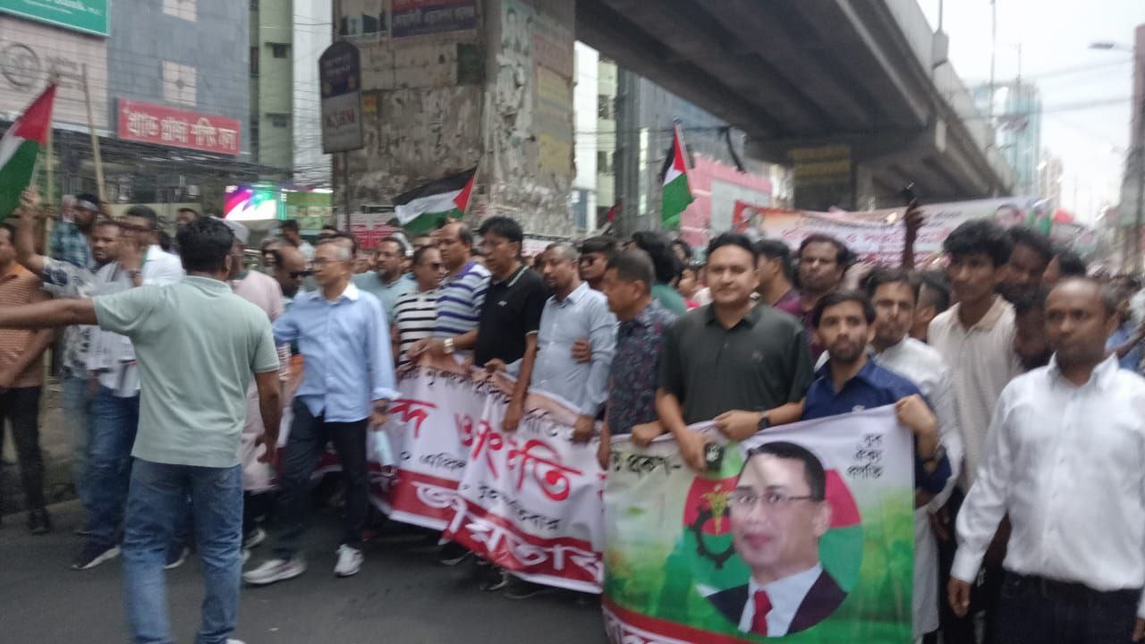গাজা ও রাফায় ইসরায়েলের নৃশংস গণহত্যার প্রতিবাদ এবং নির্যাতনের শিকার ফিলিস্তিনিদের প্রতি সংহতি জানিয়ে বাংলাদেশ জাতীয়তাবাদী যুবদলের আয়োজিত প্রতিবাদ সমাবেশ ও সংহতি র্যালি