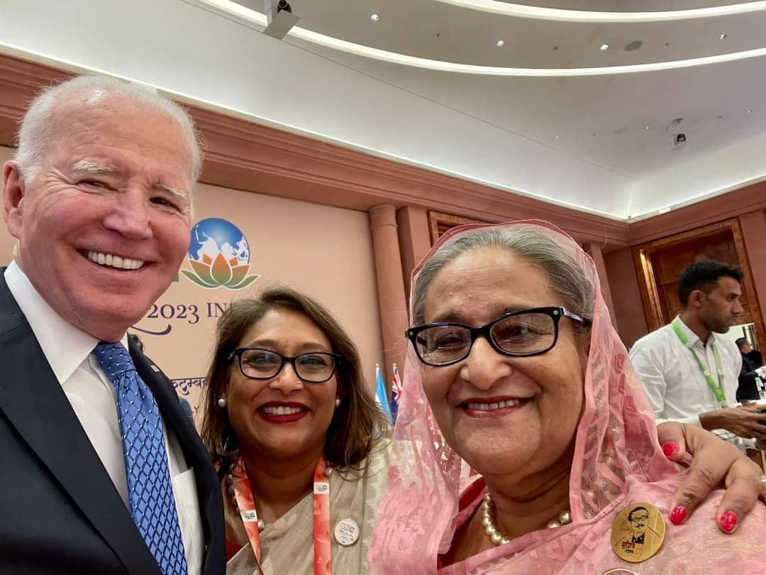 দিল্লির ‘ভারত মন্ডপম’ কনভেনশন সেন্টারে শনিবার (৯ সেপ্টেম্বর) জি২০ শীর্ষ সম্মেলনের উদ্বোধনী অধিবেশন শেষে জো বাইডেন প্রধানমন্ত্রী শেখ হাসিনা ও তার মেয়ে ক্লাইমেট ভালনারেবল ফোরামের (সিভিএফ) থিম্যাটিক অ্যাম্বাসেডর সায়মা ওয়াজেদ পুতুলের সঙ্গে এই সেলফি তোলেন।