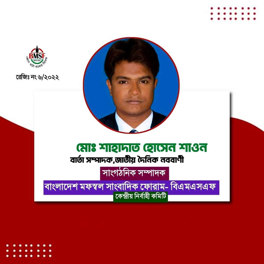 মোঃ সাবিউদ্দিন: সাংবাদিকদের অধিকার আদায়ের সংগঠন বাংলাদেশ মফস্বল সাংবাদিক ফোরাম কেন্দ্রীয় কমিটিতে সাংগঠনিক সম্পাদকের দায়িত্ব পেয়েছেন মোঃ শাহাদাত হোসেন শাওন।